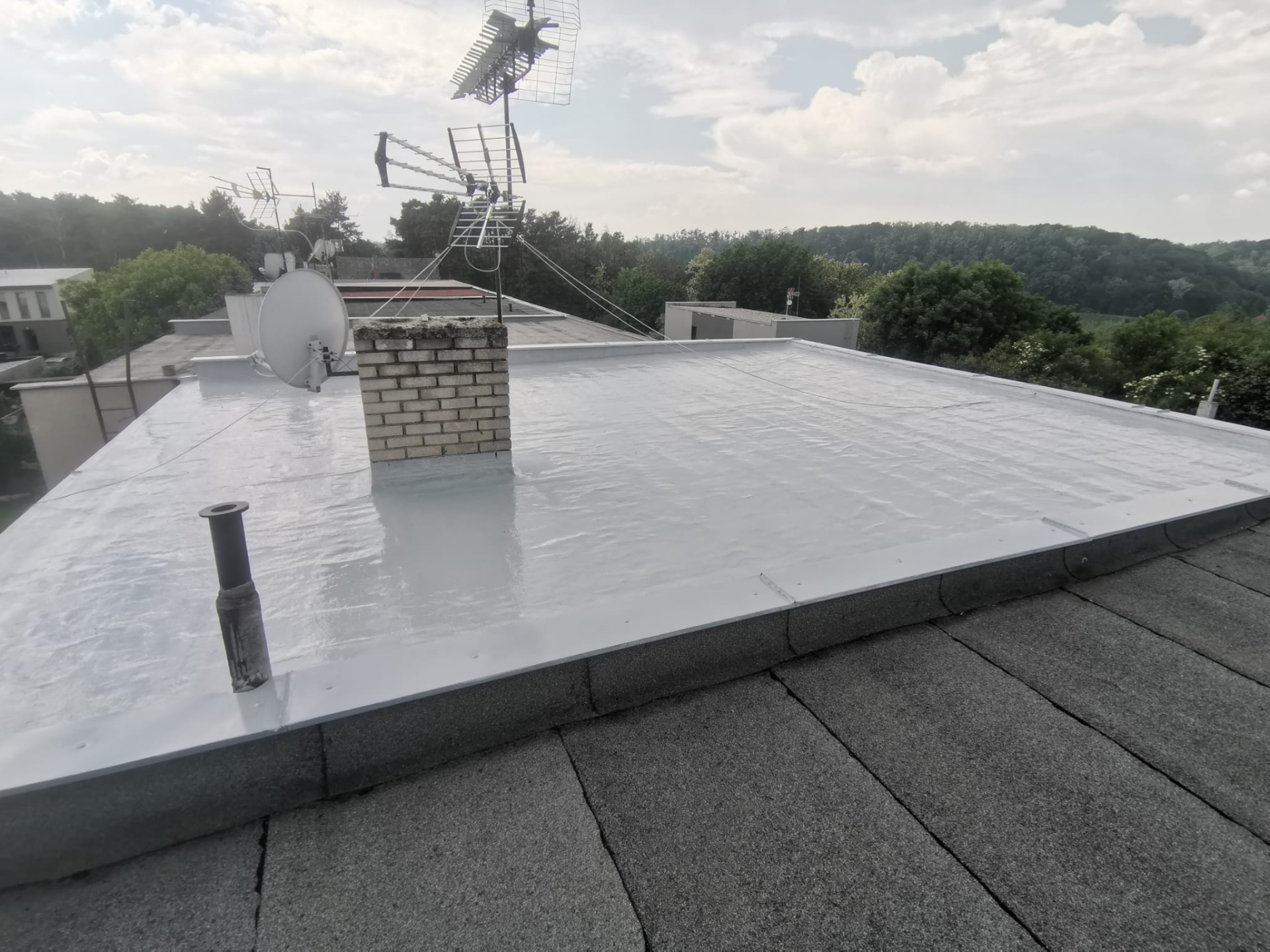 V rámci této realizace jsme provedli renovaci střechy rodinného domu pomocí tekuté hydroizolace bez nutnosti odstranění původní krytiny. Díky tomu byla rekonstrukce rychlá, šetrná a bez zbytečných zásahů do konstrukce.